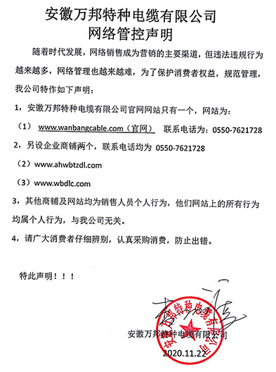 鄭重聲明:安徽萬邦特種電纜有限公司官方網站為:www_wanbangcable_com.quammnet.com.cn,除此之外無任何子網站或合作網站,其余均為假冒偽劣。電話:0550-7621728 13485756353 地 址:安徽省天長市滁州高新技術產業開發區經四路29號